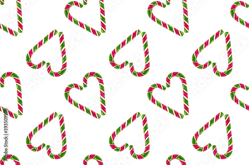 Seamless Christmas pattern with candy cane with green and red stripes. Hand painted watercolor illustration on white background