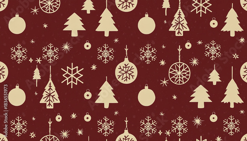 Seamless Christmas Pattern with Festive Icons, Snowflakes, and Holiday Ornaments on Red Background