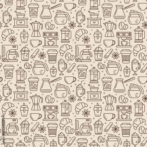 Seamless coffee pattern with line style icons. Coffee shop or cafe background.