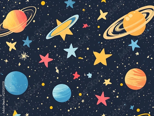 Seamless Cosmic Pattern with Glittering Stars and Planets in the Night Sky