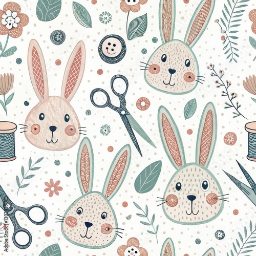 Seamless Crafting Fun with Playful Rabbits Home Studio Pattern Design Whimsical Top-Down View Child-Friendly Decor