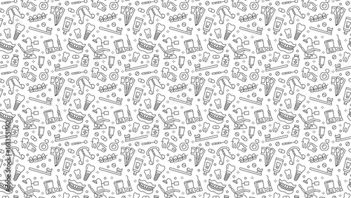 Seamless dental pattern featuring teeth implants braces and dental instruments in black and white