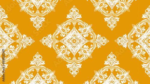 Seamless elegant white damask pattern with floral motifs on warm golden yellow background