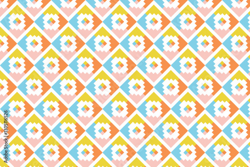 Seamless ethnic geometric pattern with colorful diamond shapes in yellow, orange, blue, and white. Perfect for textiles, wallpapers, packaging, and creative designs.