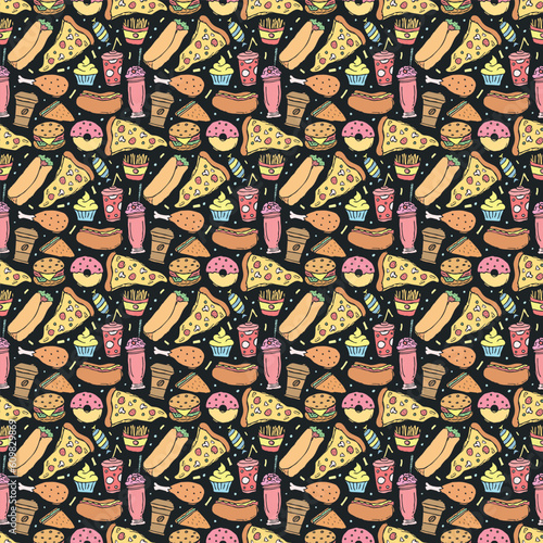 Seamless fast food pattern. fast food background. Doodle fastfood icons. Drawn food pattern
