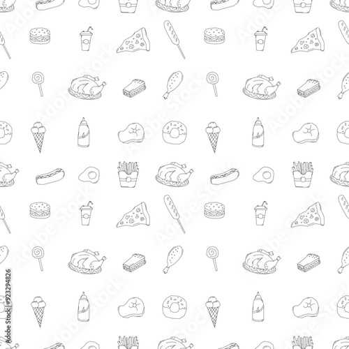 Seamless fast food pattern. fast food background. Doodle fastfood icons. Drawn food pattern