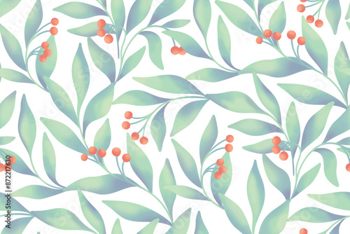 Seamless floral pattern, abstract watercolor ornament with wild berries in folk motif. Botanical design, wallpaper, textile print: small berries, large leaves on white background. Vector illustration.