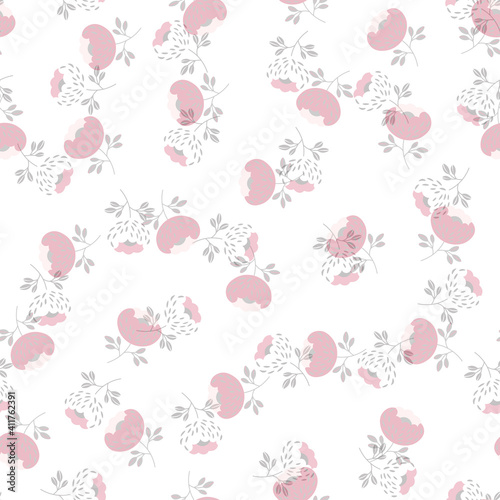 Seamless floral pattern based on traditional folk art ornaments. Colorful flowers on white background. Scandinavian style. Sweden nordic style. Vector illustration. Simple minimalistic pattern.