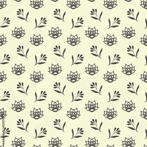 Seamless floral pattern featuring lotus blossoms and leaves in calm, minimalist style ideal for spiritual resources, mindfulness materials or meditative themes. Vector art