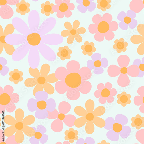 Seamless floral pattern in simple, cute cartoon style. Pastel background and flowers. Design for covers, fabric and wallpaper. Vector, universal illustration