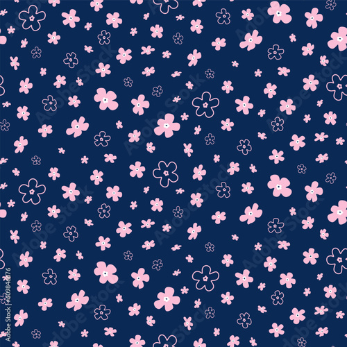 Seamless floral pattern. Small pink flowers on navy background.