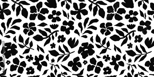 Seamless floral pattern with black silhouettes of flowers and leaves on a white background. Elegant botanical design for fabric, wallpaper, wrapping paper, textile, and digital projects. Vector art