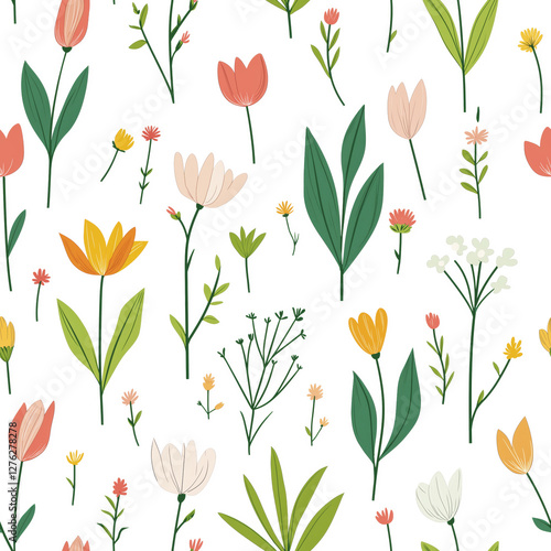 Seamless floral pattern with colorful hand-drawn flowers and green leaves on a white background creating a fresh and cheerful design perfect for fabric, wallpaper, or decorative projects