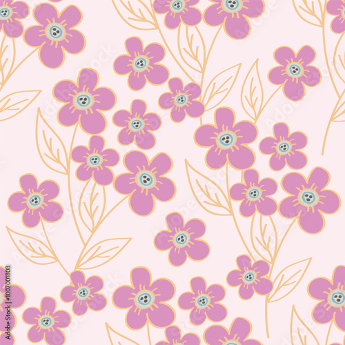 Seamless floral pattern with pink and blue flowers on a white background, hand painted in watercolor.