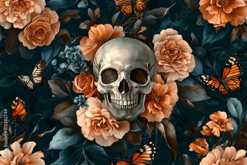 Seamless Floral Pattern with Skull, Flowers, Butterflies on Dark Blue Background - Beautiful and Intricate Design Detail