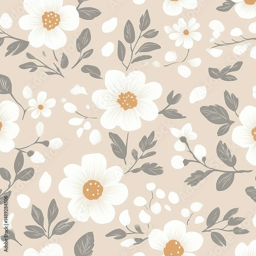 Seamless floral pattern with white flowers, golden centers, and gray leaves on a soft beige background creating a calm and elegant aesthetic