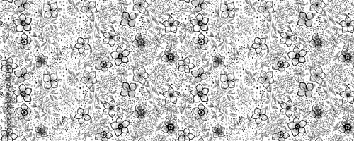Seamless floral vector pattern with silhouette rose аnd bud. Black paint illustration with abstract floral motif. Graphic hand drawn brush stroke botanical pattern.