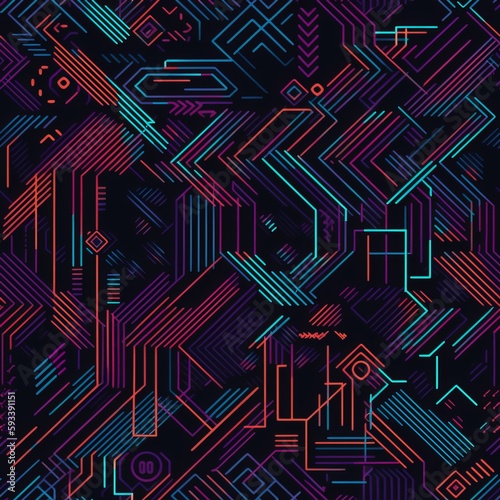 Seamless Futuristic Cyberpunk Pattern with Neon Lines and Geometric Shapes