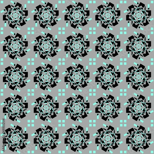 Seamless geometric abstract pattern with black mandala-like shapes and turquoise accents on gray background, modern decorative design for textile, wallpaper, and digital art.