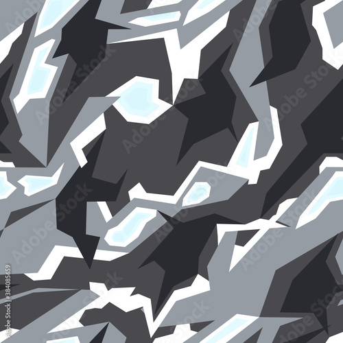 Seamless geometric pattern of gray and dark shapes. Camo Racing background on vinyl and decal. Hipster print