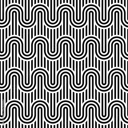 Seamless geometric striped pattern. Monochrome striped loopy ribbon, with maze elements. Geometric graphic texture. Endless striped monochrome background with winding elements. Vector
