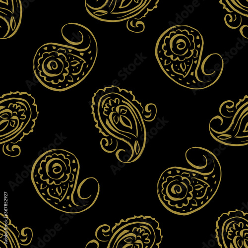Seamless gold paisley pattern on white background. Oriental decoration print. Boho style, for wrapping, wallpaper, fabric. Indian ornament