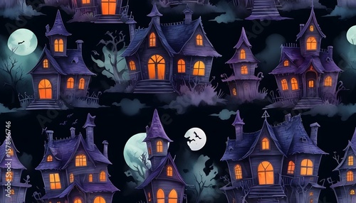 Seamless Halloween design with haunted houses, ghosts, bats, and a full moon, all in a whimsical watercolor style