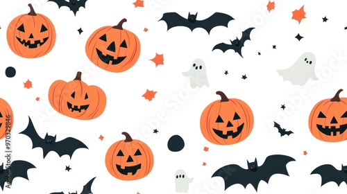 Seamless Halloween pattern featuring bats pumpkins and ghosts on a white background