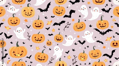 Seamless Halloween pattern with cartoon pumpkins, cute ghosts, and bats on a pink background.