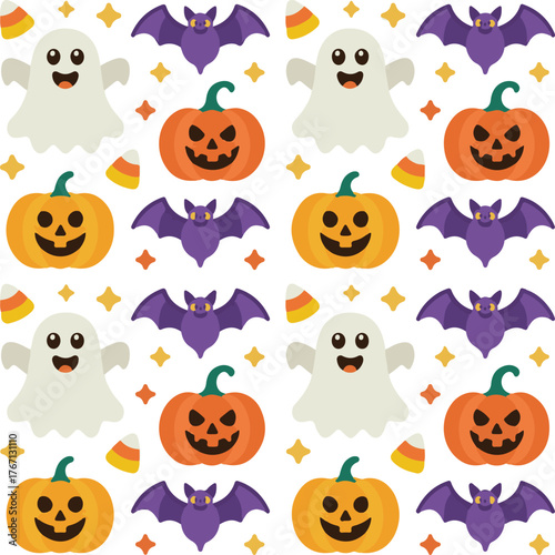Seamless Halloween Pattern with Cute Ghosts, Pumpkins, Bats, and Candy Corn – Tileable Flat Vector Design