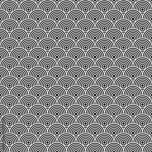 Seamless japanese pattern with scales. Fish scale wallpaper. Asian traditional ornament with repeated scallops. Repeated circles and semicircles background. Vinyl motif. Surface design. Vector art.