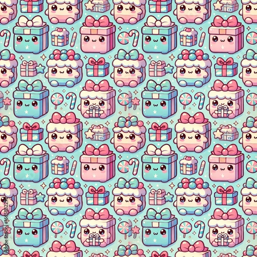 Seamless kawaii Christmas pattern with cute gift boxes, candy canes, sweets, and festive decorations