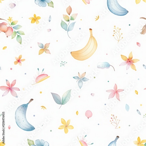 Seamless kids pattern with watercolor baby little banana drawing illustration on white background