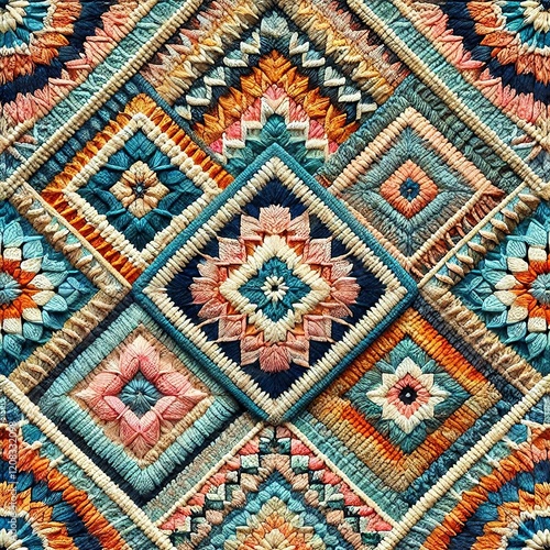 Seamless knitted pattern in the form of gradient rhombuses is crocheted with multi-colored threads. Patchwork style. AI generated.