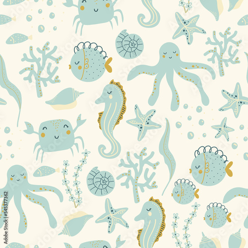 Seamless marine pattern blue fish, crab, seahorse, seashells, octopus, corals digital paper, for surface design, kids clothing,print