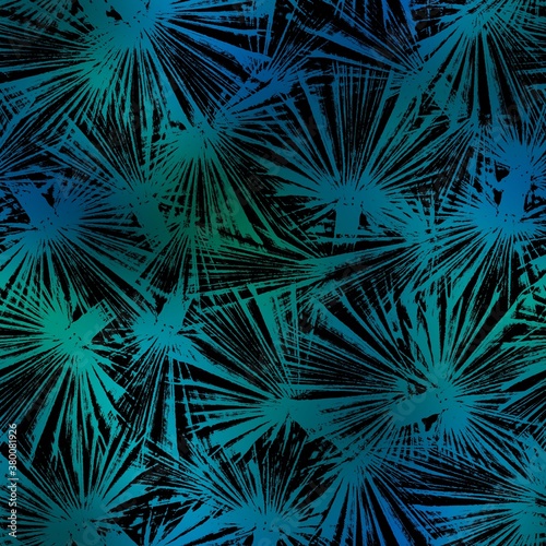 Seamless Miami night tropical pattern black foliage on sunset blur. High quality illustration. Swim, sports, or resort wear repeat print. Dark foreground on blurred background. Dark vibrant colors.
