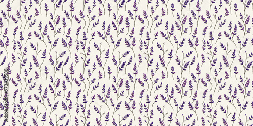 seamless minimalistic embroidery pattern of small lavenders, on a plain ivory fabric