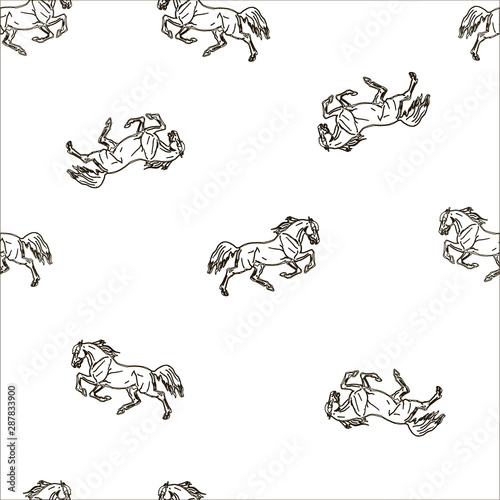 seamless monochrome halophilic horse background, ink drawing, silhouettes and contours, and white color background