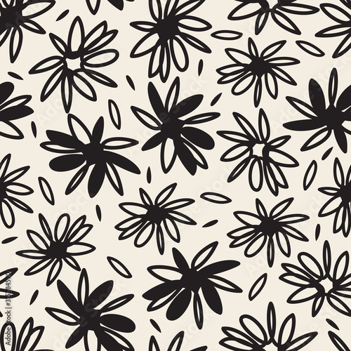 seamless monochrome hand drawn flower with leave pattern background