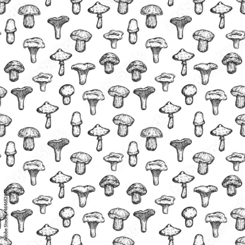 Seamless monochrome pattern with mushrooms isolated on white background. Template for branding fresh organic food, textile, ads. Vector illustration.