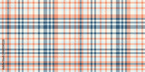 Seamless pastel plaid pattern in peach, blue, and white. Ideal for textile design, website backgrounds, or crafting projects.