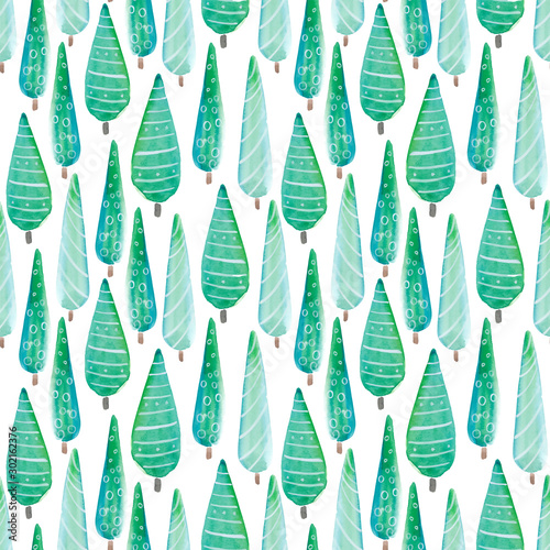 Seamless pattern: green watercolor Christmas trees. Hand-drawn