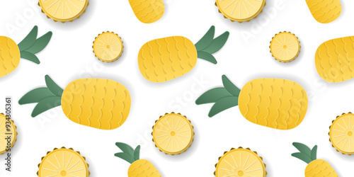 Seamless pattern 3d papercut pineapple sliced cutout fruit. Summer layered fruits for restaurant, food, drinks, bars, recipes, summer, sweets, vegan, social media, presentation design.
