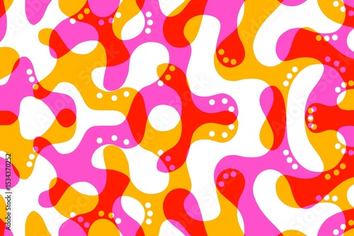 Seamless pattern, abstract organic lines color background. Biological pattern with yellow, red and pink memphis dots, irregular waves and abstract shape texture
