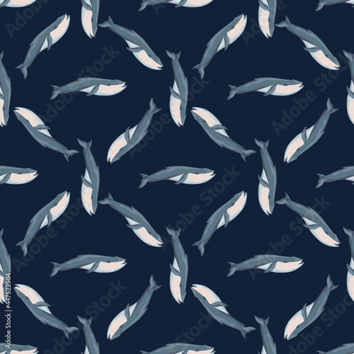 Seamless pattern Blue whale on black background. Template of cartoon character of ocean for fabric.