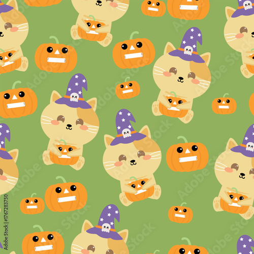 Seamless pattern cartoon kitty with halloween pumpkin and halloween element drawing. cute drawing for wallpaper and background