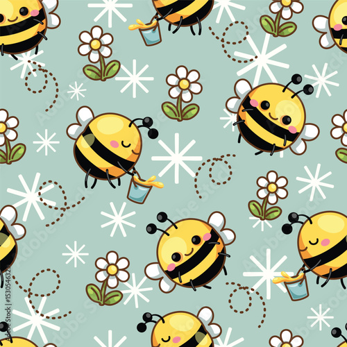 Seamless pattern cartoon of A bright and hardworking little bee and a cute little flower. It is a kawaii character cartoon. Pattern design for wrapping paper, wallpaper and fashion prints.
