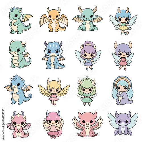 Seamless Pattern, Collection of charming cartoon dragon and fairy creatures in vibrant colors Stock royalty free