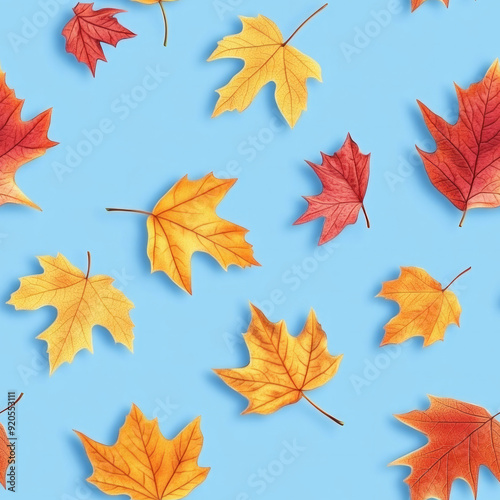 Seamless pattern colorful autumn leaves isolated on blue background leaf texture with stems and red orange yellow fall colors art illustration wallpaper backdrop repeating pattern.