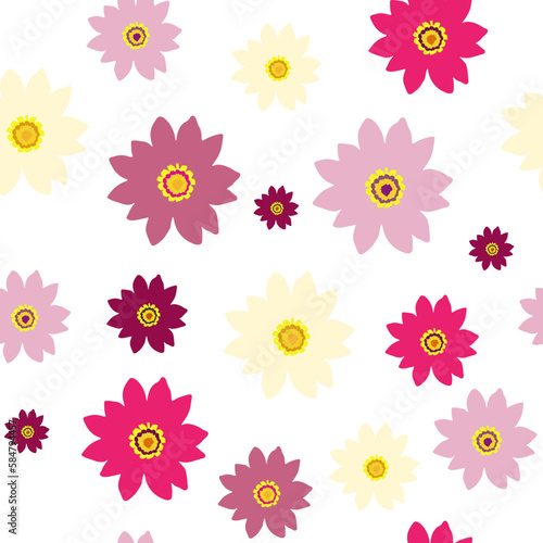 Seamless pattern colorful Gazania on white background. Big and small garden flowers ornament, vector design eps 10